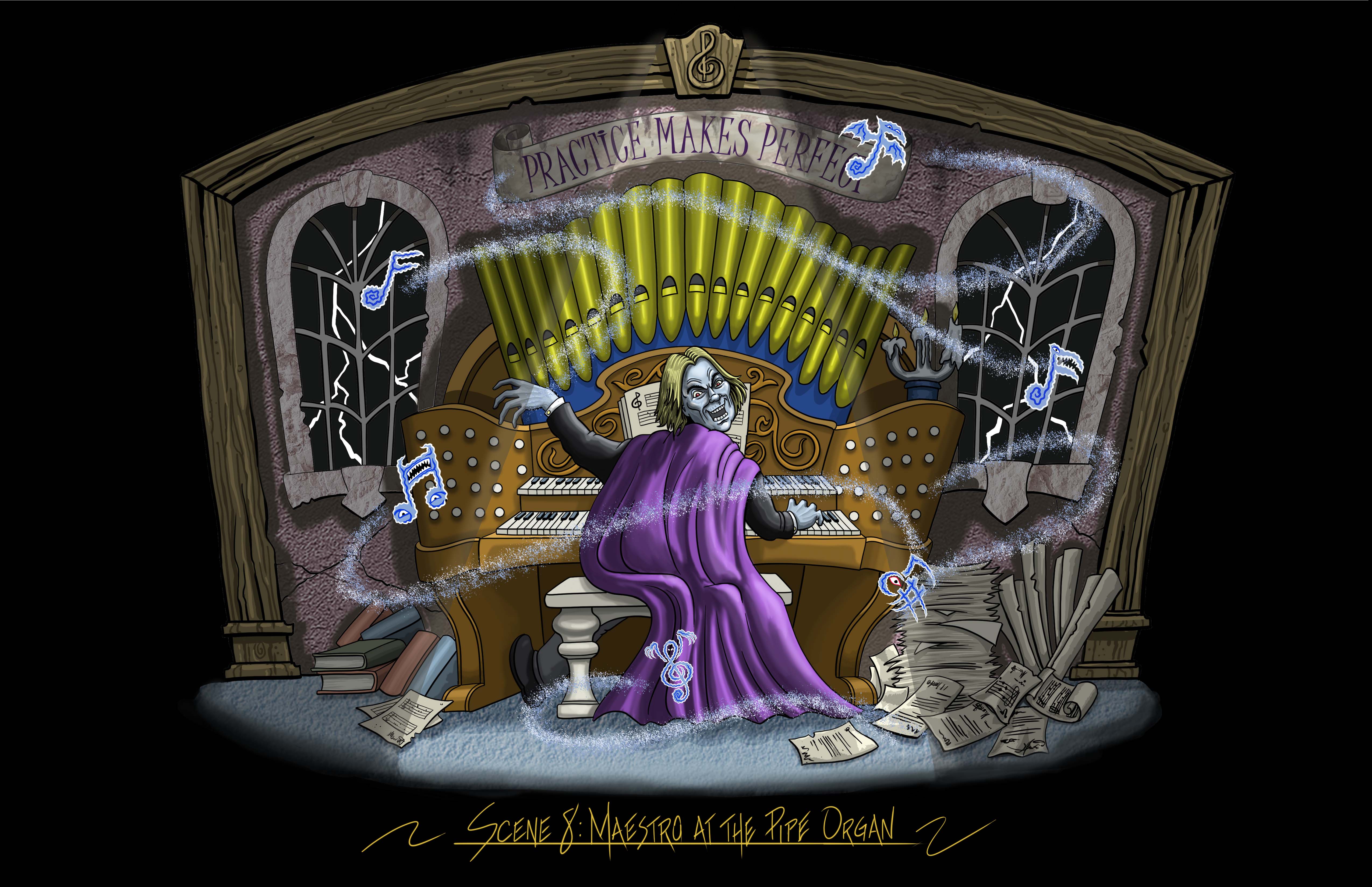 The comedic and fast-paced family adventure begins with a dark and stormy night, setting the tone for the grand (and ghostly) re-opening of the haunted Phantom Theater. Inside, a long-awaited performance by Maestro is set to begin. During the storm, a lightning strike unleashes the ghost notes – mischievous musical spirits that wreak havoc across the theater – from Maestro’s mighty pipe organ.